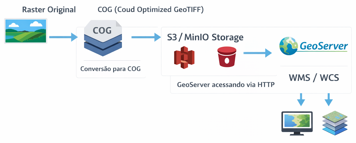 Essa combinação permite que o GeoServer leia diretamente rasters armazenados em object storage, sem precisar copiá-los para o servidor.